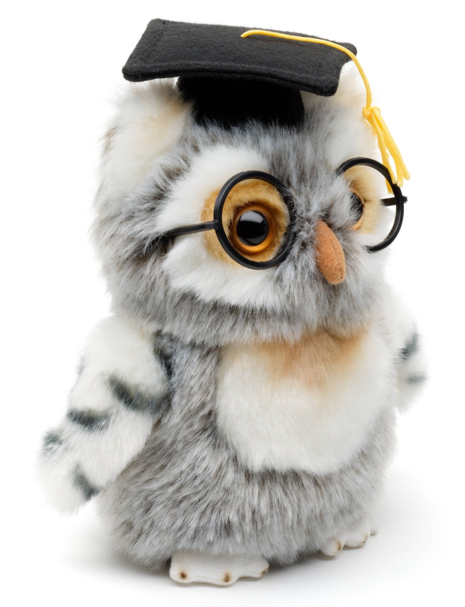 SELECTED QUALITY: High-quality materials - First-class workmanship - Fluffy soft plush - Tested safety SUSTAINABLE: 100% recycled filling material Dimensions: length 10 cm, width 14 cm, height 18 cm MATERIALS: outer material: 58% acrylic, 42% polyester; filling material: 100% recycled polyester PRODUCT NAME: Owl (gray-white) with doctoral hat and glasses - 18 cm (height) - Keywords: degree, baccalaureate, bachelor, master's examination, doctor, doctoral thesis, habilitation, celebration bird, plush, plush toy, stuffed animal, stuffed animal